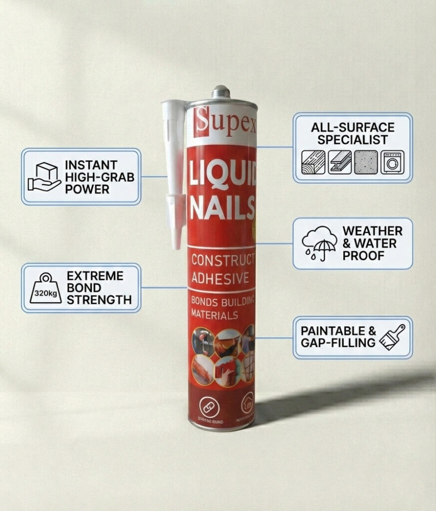 High-strength Supex adhesive can be stronger than nails in many applications because it distributes load evenly across surfaces.