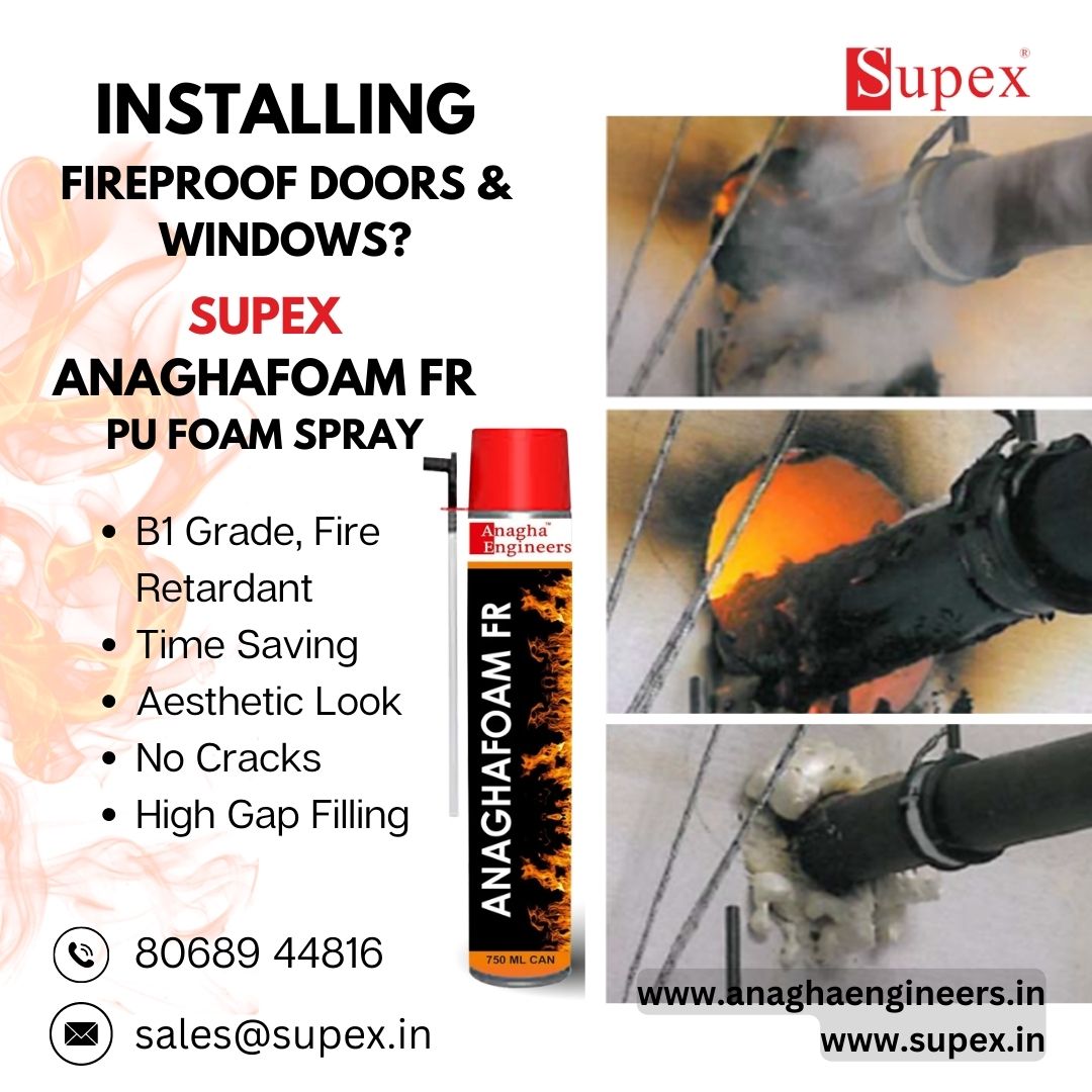 Supex Anaghafoam FR Polyurethane Foam is a fire-retardant, expandable insulation foam that seals, insulates, and prevents the spread of fire, smoke, and gas. Rated B1 under DIN 4102, it delivers strong adhesion to wood, metal, glass, and concrete while providing excellent heat and sound insulation for safer, more durable buildings.